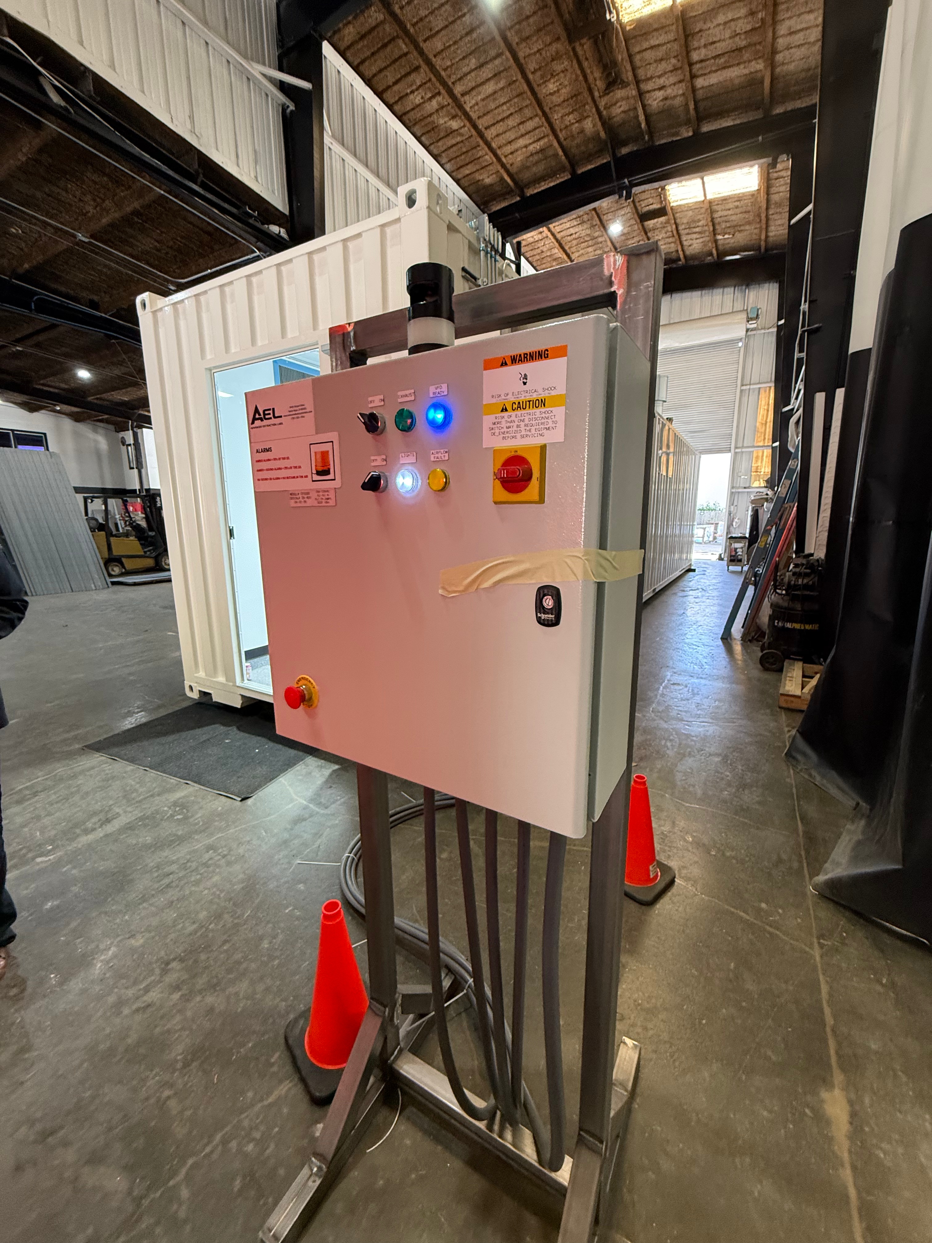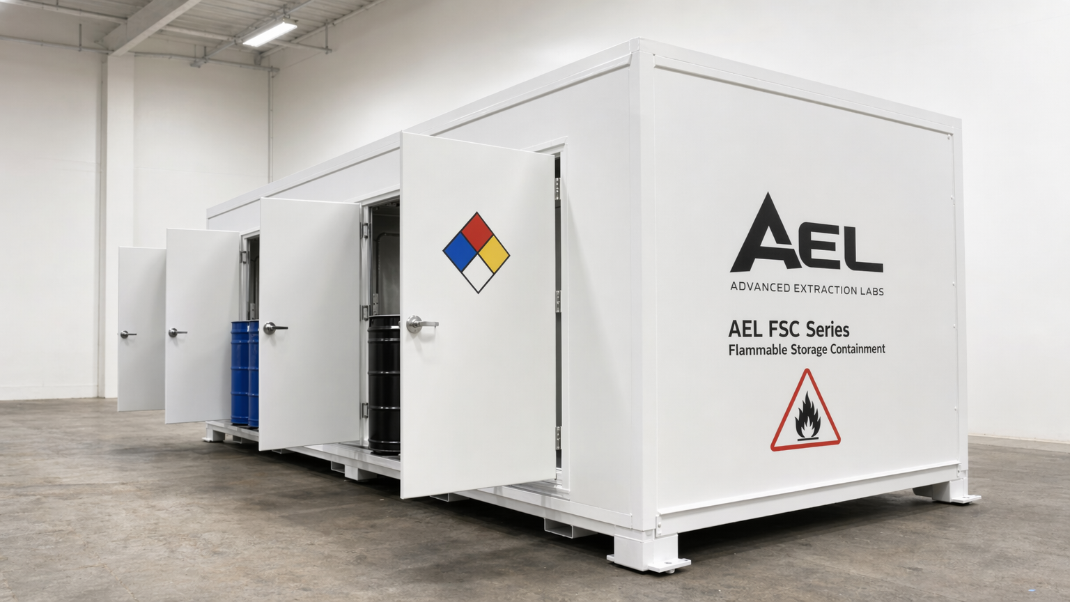 AEL manufactures C1D1 and C1D2 extraction booths (indoor and outdoor), GMP-compliant processing rooms, battery storage containers (Energy Cubes), blast resistant buildings, chemical solvent containers, clean rooms, fume hoods, commercial kitchens, grow containers, mushroom lab systems, modular panel systems, and fire suppression systems. All products are built in our Santa Rosa, California facility.